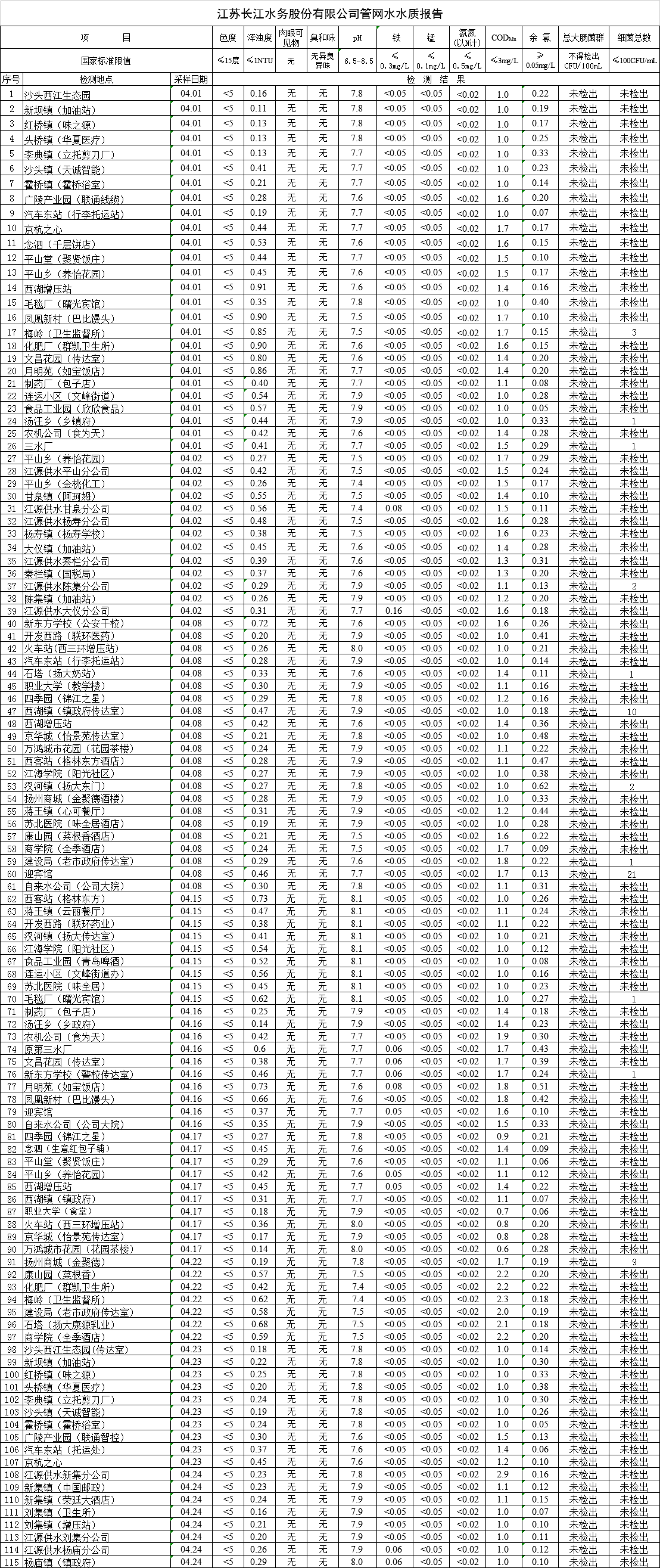 江蘇長(zhǎng)江水務(wù)股份有限公司管網(wǎng)水水質(zhì)報(bào)告(2019年4月)