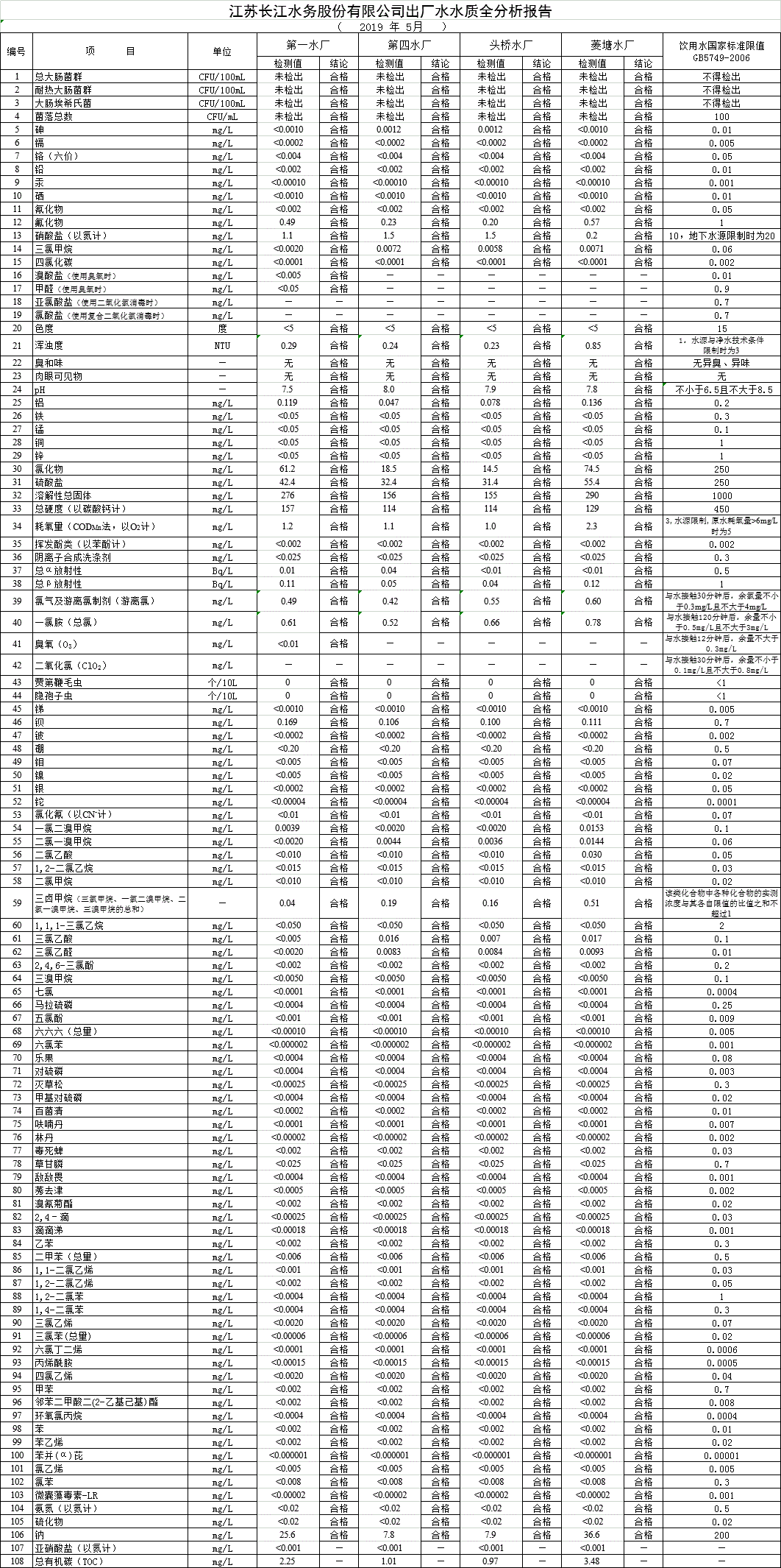 江蘇長(zhǎng)江水務(wù)股份有限公司管網(wǎng)水水質(zhì)報(bào)告(2019年5月)