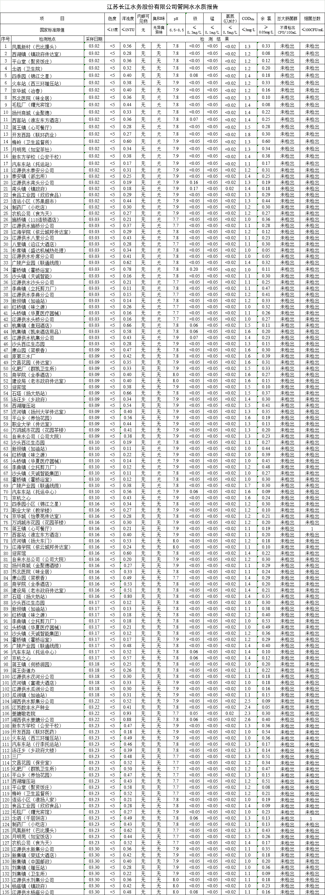 江蘇長江水務(wù)股份有限公司管網(wǎng)水水質(zhì)報告(2020年3月)