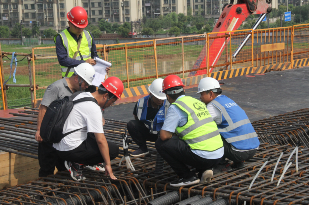 時(shí)值梅雨季節(jié),持續(xù)的降雨天氣給項(xiàng)目施工帶來了諸多不便。為確保人員安全及工程穩(wěn)步推進(jìn),項(xiàng)目部克服了現(xiàn)場(chǎng)10KV和220KV高壓線及梅雨季節(jié)影響,科學(xué)優(yōu)化施工方案、倒排節(jié)點(diǎn)工期、細(xì)化施工計(jì)劃,在做好模板拼裝預(yù)壓、鋼筋綁扎等工作的同時(shí),明確分工、責(zé)任到人,為兩聯(lián)箱梁的順利澆筑提供先決條件。