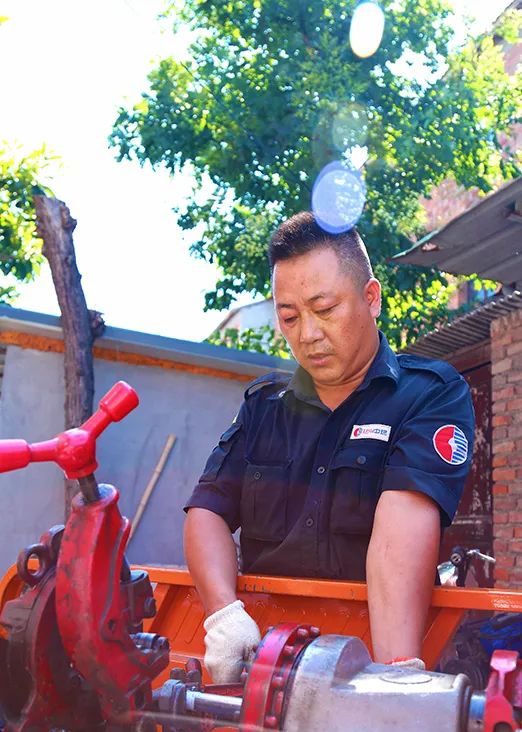 8月18日,為避開高溫天氣,管道安裝工仲飛清晨5點多準時到達駐點,和伙伴們完成備料備件后,迎著朝霞趕赴揚州老城區(qū)北講經(jīng)墩居民家中。由于完全是戶外曝曬作業(yè),他身上的工作服濕了又干,干了又濕,泛起層層白色鹽霜。