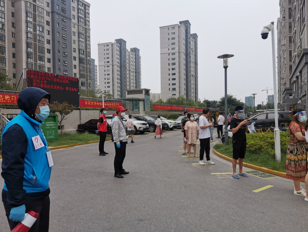 “請(qǐng)大家排好隊(duì),保持一米以上安全距離,不要造成人員聚集,請(qǐng)?zhí)崆皽?zhǔn)備好你的身份證……”志愿者不斷提醒居民注意。在翠月花園核酸采集點(diǎn),志愿者們穿梭在排隊(duì)人群中,邊安撫居民緊張情緒,邊引導(dǎo)居民即測(cè)即走。“雖然天氣很悶熱,工作量很大,但是我們有信心能保質(zhì)保量完成全小區(qū)核酸檢測(cè)任務(wù)。”他們不顧喉嚨嘶啞,依舊熱情且耐心地回答居民的問題,引導(dǎo)現(xiàn)場(chǎng)秩序。11日下午,雨淅淅瀝瀝下個(gè)不停。雖然避雨棚近在咫尺,但志愿者們面對(duì)風(fēng)雨寸步不離崗位,他們笑著說道“這點(diǎn)風(fēng)雨算啥呀?”一周來,志愿者們協(xié)助社區(qū)開展了4次核酸檢測(cè),共檢測(cè)居民約12000人次。