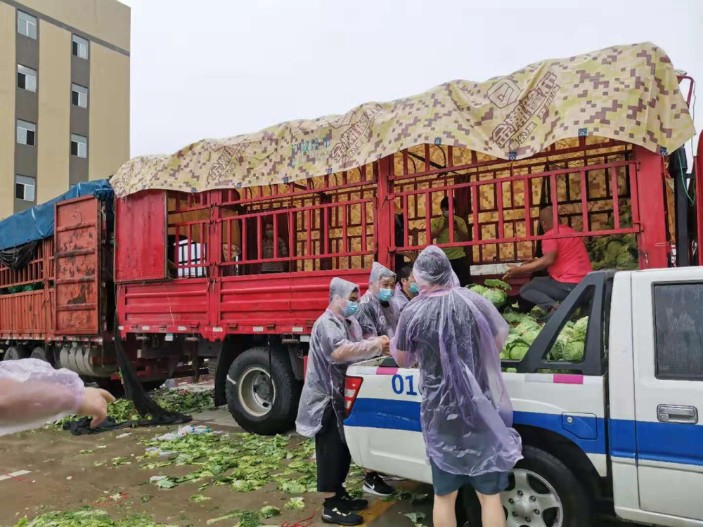 14:30,天空開始飄起雨點(diǎn),大家依舊堅(jiān)守在各自的崗位上,很快雨點(diǎn)就打濕了衣服和頭發(fā),可現(xiàn)場(chǎng)沒有一個(gè)人退下躲雨?!斑@車卸得差不多了,我們?nèi)ツ沁厧兔Α?,“邗江區(qū)轉(zhuǎn)運(yùn)蔬菜的車來了,需要10個(gè)人裝車”,“我去”“我也去”,現(xiàn)場(chǎng)只有時(shí)不時(shí)這樣的聲音傳來。