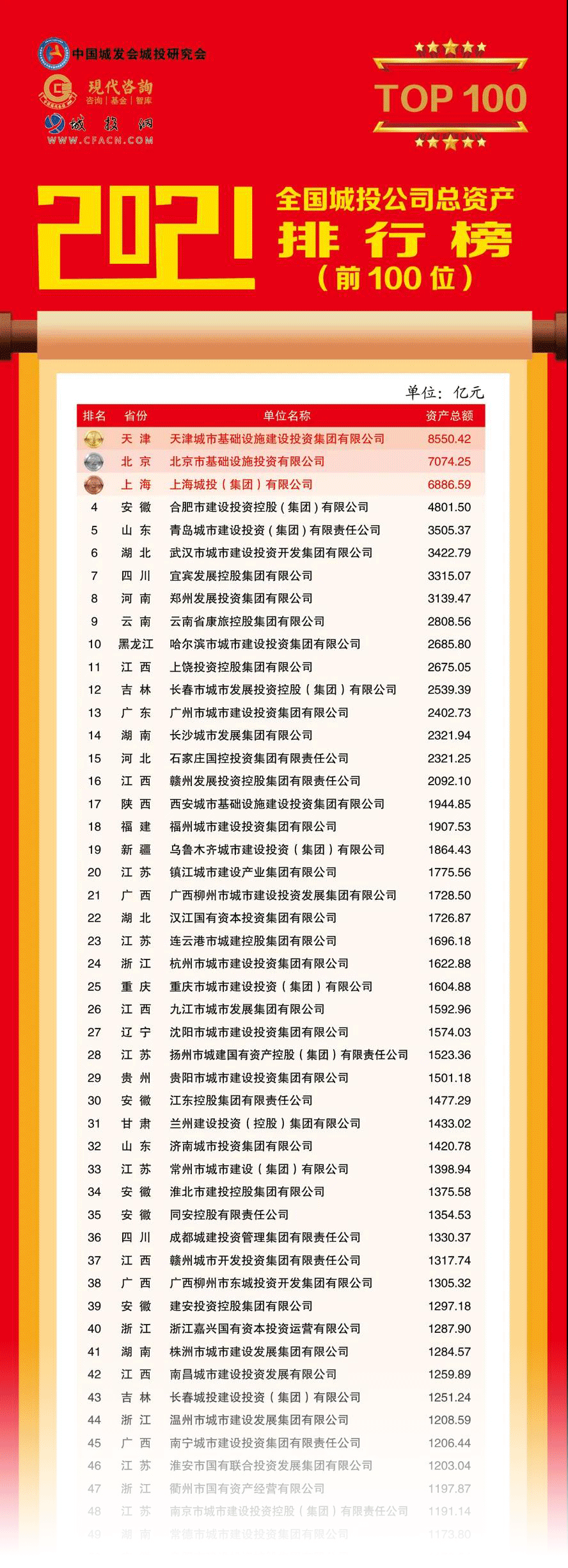 該排行榜由中國城市發(fā)展研究會城市建設(shè)投融資研究專業(yè)委員會(簡稱”中國城發(fā)會城投研究會”)、江蘇現(xiàn)代資產(chǎn)投資管理顧問有限公司(簡稱“現(xiàn)代咨詢”)和城投網(wǎng)聯(lián)合發(fā)布,迄今已連續(xù)發(fā)布8年,主要反映全國城投公司規(guī)模變化的總資產(chǎn)排名情況,目前已成為全國城投行業(yè)群體發(fā)展狀況和城投轉(zhuǎn)型升級的權(quán)威發(fā)布。