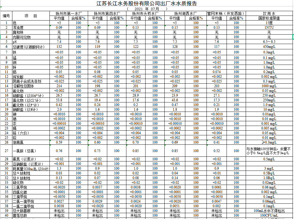 江蘇長(zhǎng)江水務(wù)股份有限公司出廠水水質(zhì)報(bào)告 (2021年07月)