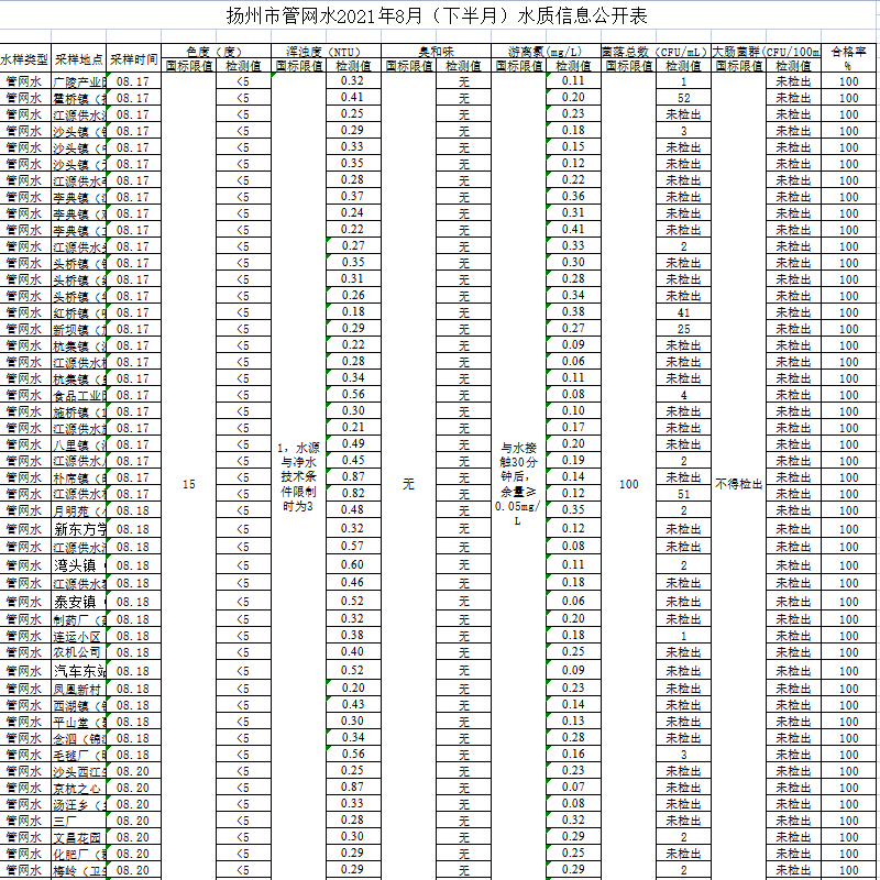 揚州市管網(wǎng)水2021年8月(下半月)水質(zhì)信息公開表
