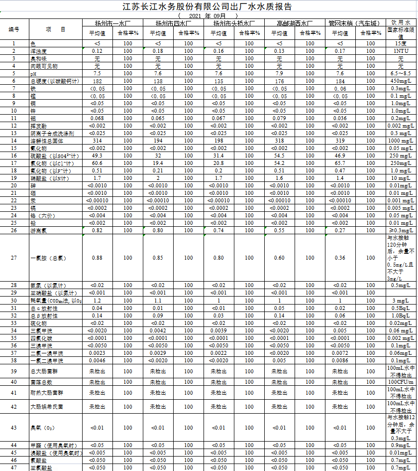 江蘇長江水務(wù)股份有限公司出廠水水質(zhì)報(bào)告 ( 2021 年 09月 )