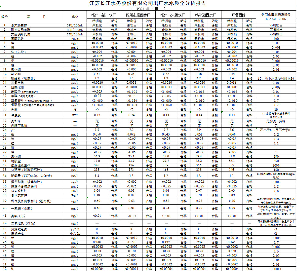 江蘇長江水務(wù)股份有限公司出廠水水質(zhì)全分析報(bào)告 (2021年11月)