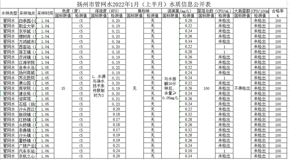 揚(yáng)州市管網(wǎng)水2022年1月(上半月)水質(zhì)信息公開表