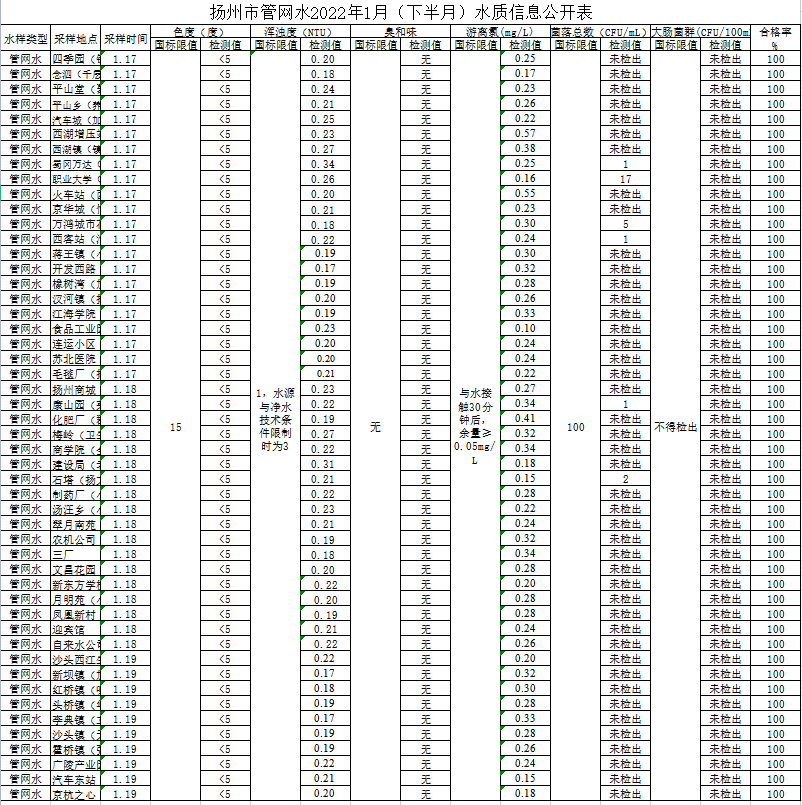 揚(yáng)州市管網(wǎng)水2022年1月(下半月)水質(zhì)信息公開表