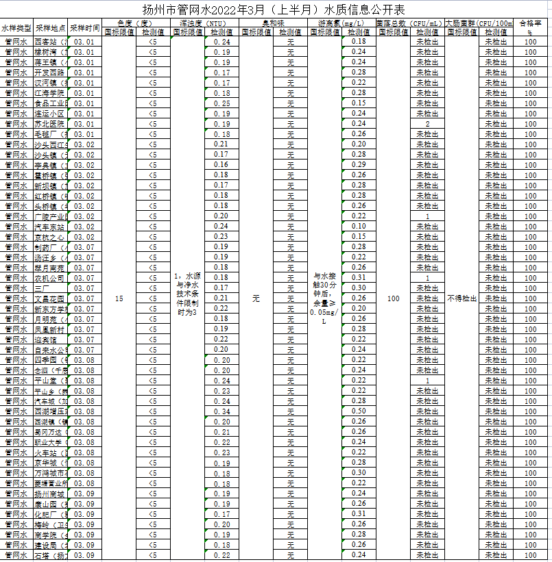 揚州市管網水2022年3月(上半月)水質信息公開表