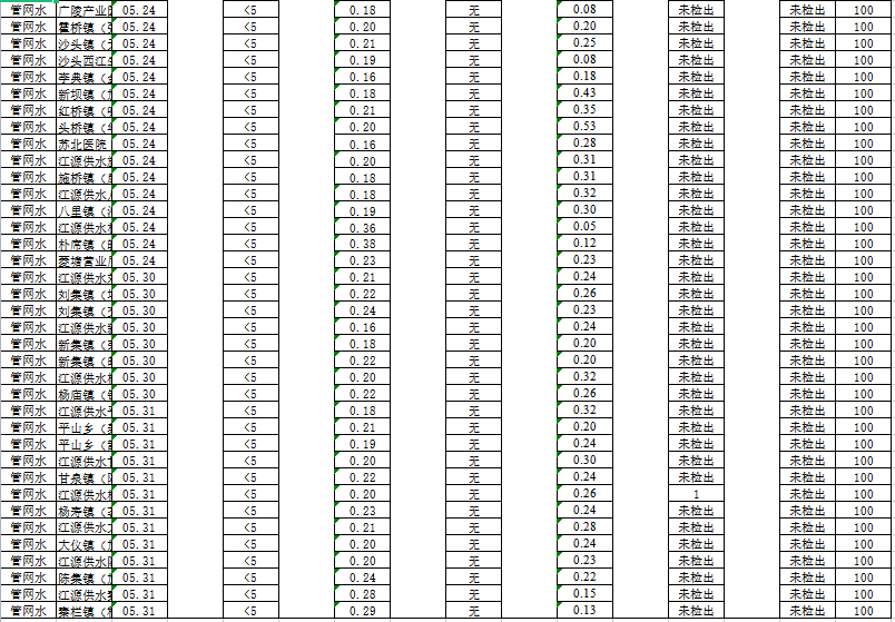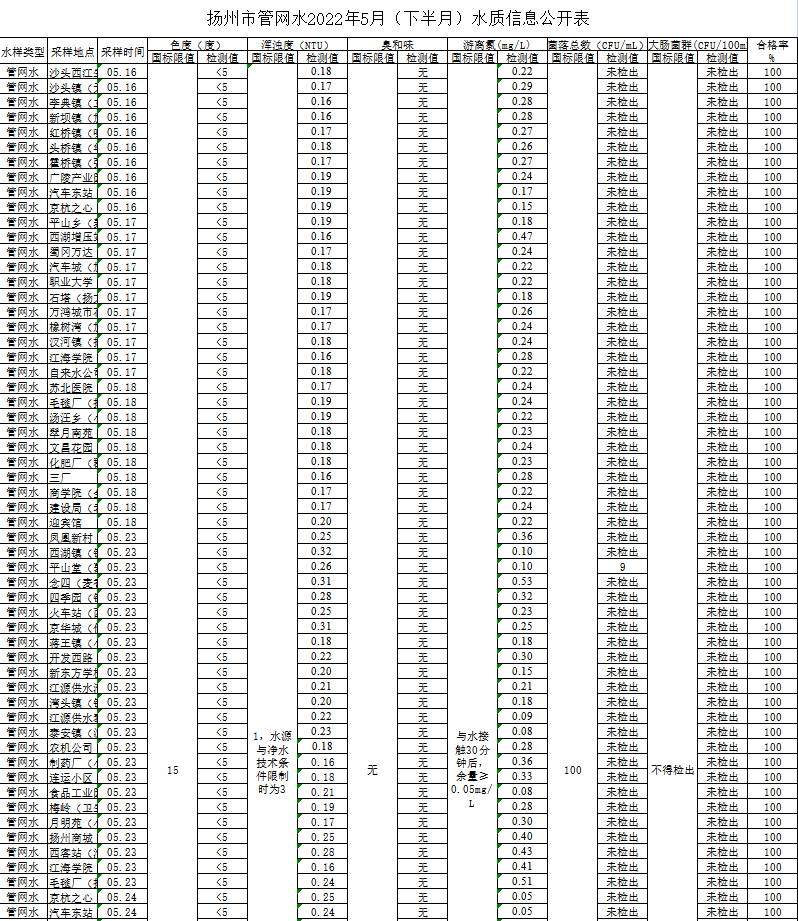 揚(yáng)州市管網(wǎng)水2022年5月(下半月)水質(zhì)信息公開表