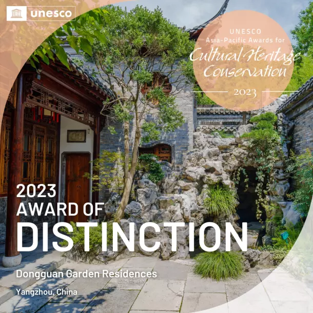 東關歷史文化街區(qū)位于揚州明清古城東北隅,東起古運河,西至國慶路,南臨文昌中路,北達鹽阜東路,面積3.4平方公里,是城內迄今保存最為完整、規(guī)模最大的歷史文化街區(qū)。街區(qū)沿線歷史遺存薈萃,其中個園、汪氏小苑、唐宋東門遺址、逸圃為國家級文物保護單位,曹起溍故居、壺園、劉文淇故居、丁姓鹽商住宅等為市級文物保護單位。2023年末,聯(lián)合國官網發(fā)布了《2023年亞太文化遺產保護獎獲獎者名單》。“東關歷史文化街區(qū)園宅保護與傳承復興項目”從亞太地區(qū)8個國家48個參賽項目中脫穎而出,獲評聯(lián)合國教科文組“2023年度亞太文化遺產保護獎杰出獎”。是全國唯一獲得“杰出獎”的文保項目。聯(lián)合國教科文組織在項目評審語中寫到“東關歷史文化街區(qū)是傳統(tǒng)文化與當代景觀設計的完美結合,為亞太地區(qū)古典園林保護及活化利用提供了重要參考”。