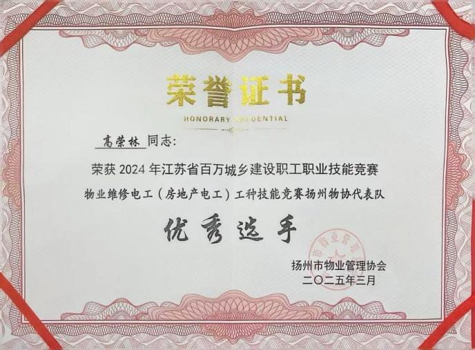 維修電工(房地產(chǎn)電工)工種技能競賽“優(yōu)秀選手 ”,高榮林同志,憑借出色的工作技能,在省級競賽“江蘇省百萬城鄉(xiāng)建設(shè)職工職業(yè)技能競賽物業(yè)維修電工(房地產(chǎn)電工)工種技能競賽”中榮獲“優(yōu)秀選手 ”稱號。這一榮譽稱號,不僅是對該名員工個人能力的認可,更是對城建物業(yè)在員工培養(yǎng)與團隊建設(shè)方面的肯定。