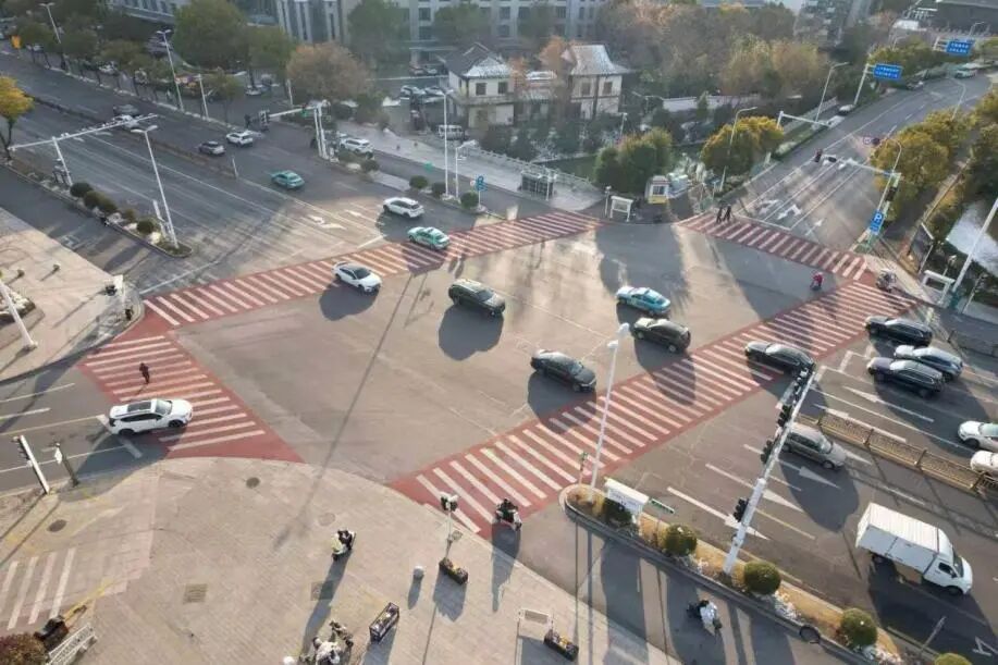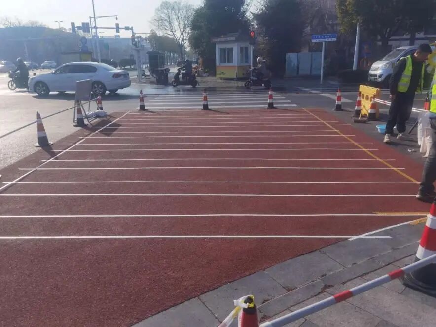 此次彩色路面與普通路面形成高對比視覺沖擊,通過視覺分區(qū),強化“行人優(yōu)先”的路權屬性,有效減少人車搶行沖突;表面的凹凸紋理使雨天的摩擦系數(shù)提升2-3倍,大幅降低濕滑路段交通事故發(fā)生率;采用環(huán)氧樹脂和陶瓷骨料復合材料,耐磨性強、抗老化性優(yōu),使用壽命遠超傳統(tǒng)標線,更具實用性與經(jīng)濟性,為揚州市民交通出行保駕護航。