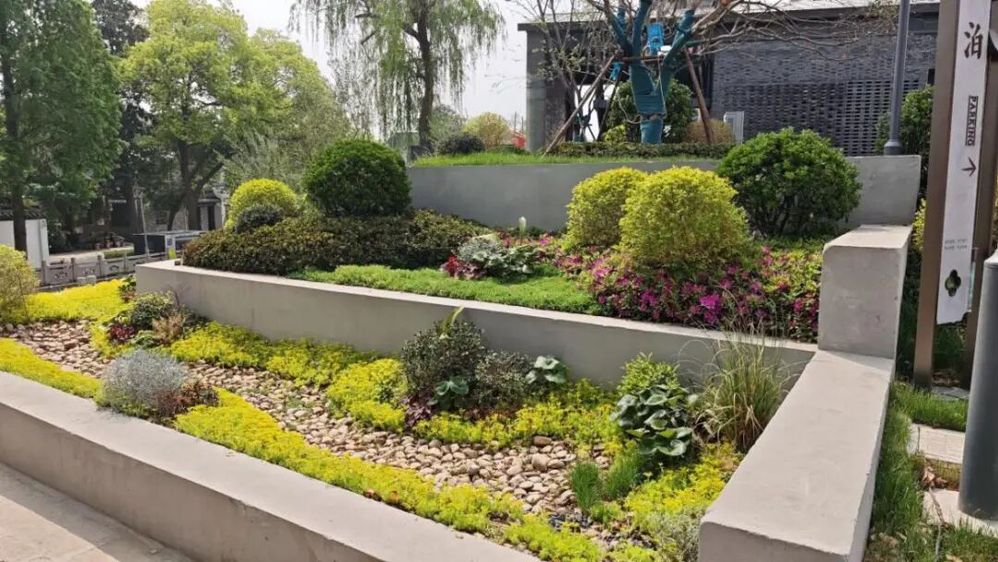 在項(xiàng)目設(shè)計(jì)中,充分考慮海綿技術(shù)與揚(yáng)州古城特色、 傳統(tǒng)園林景觀的有機(jī)結(jié)合,在保護(hù)歷史肌理的同時(shí),形成“植物選型-空間敘事-功能協(xié)同-文化表達(dá)”的全鏈條設(shè)計(jì)。主要是:結(jié)合中式庭院景觀水池進(jìn)行雨水收集、儲(chǔ)留,降低雨水徑流,合理利用雨水;結(jié)合古城區(qū)傳統(tǒng)條石鋪裝,通過條石縫隙、碎石墊層形成透水路徑,降低地表徑流,補(bǔ)充地下水,緩解城市內(nèi)澇;結(jié)合場(chǎng)地高差設(shè)置階梯花池,最大限度收集周邊街巷雨水,實(shí)現(xiàn)雨水徑流消減和面源污染降低;沿河設(shè)置微凹綠地,過濾污染物,減少土壤侵蝕,保護(hù)水體生態(tài)。這一精細(xì)化設(shè)計(jì)不僅顯著提升了城市排水效率,有效緩解了內(nèi)澇風(fēng)險(xiǎn),更實(shí)現(xiàn)了雨水資源的自然積存、滲透與凈化,為揚(yáng)州古城打造出可持續(xù)的水生態(tài)系統(tǒng)。