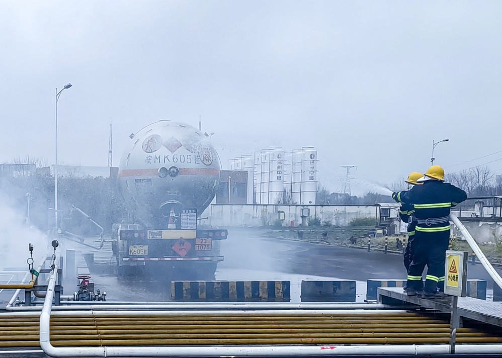 本次演練模擬液化氣槽罐車卸氣過程中突發(fā)泄漏應(yīng)急處置:卸車操作工發(fā)現(xiàn)鶴管接口泄漏后,立即通知押運員關(guān)閉車載緊急切斷閥,卸車工關(guān)停壓縮機(jī),充裝人員同步停止作業(yè)并關(guān)閉相關(guān)閥門。安保人員迅速設(shè)置警戒線,嚴(yán)禁無關(guān)人員進(jìn)入;現(xiàn)場啟用霧狀水稀釋泄漏區(qū)域液化氣濃度,待濃度降至安全范圍后,維修人員更換損壞密封圈,并用可燃?xì)怏w檢漏儀復(fù)檢確認(rèn)無隱患,隨后恢復(fù)充裝卸車作業(yè)。