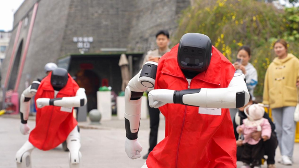 活動(dòng)現(xiàn)場(chǎng),機(jī)器人與游客的親密互動(dòng)成為最大亮點(diǎn)。人形機(jī)器人輪番獻(xiàn)上歡快的歌舞表演,利落的舞姿、悅耳的歌聲,瞬間點(diǎn)燃現(xiàn)場(chǎng)氛圍;機(jī)器狗則大展身手,流暢完成前后空翻等酷炫動(dòng)作,驚艷的姿態(tài)出彩全場(chǎng),引得過(guò)往游客紛紛駐足圍觀、拍照打卡,現(xiàn)場(chǎng)歡呼聲、喝彩聲不斷。